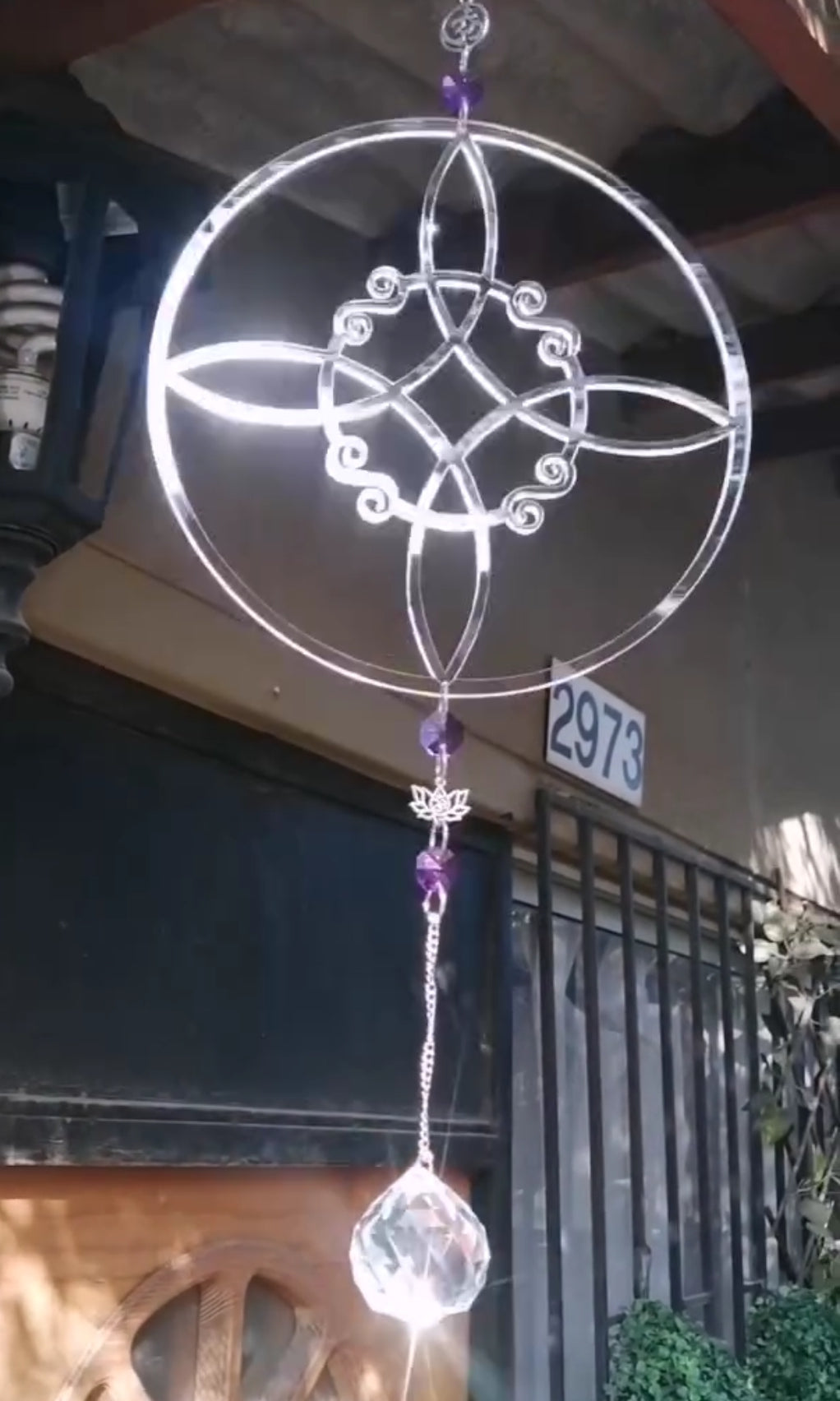 Fabricado en acrílico 3mm sublimado con flores azules cuenta con cristales que a contra luz del sol se visualizan sus colores armonizando el lugar donde se sitúe.
