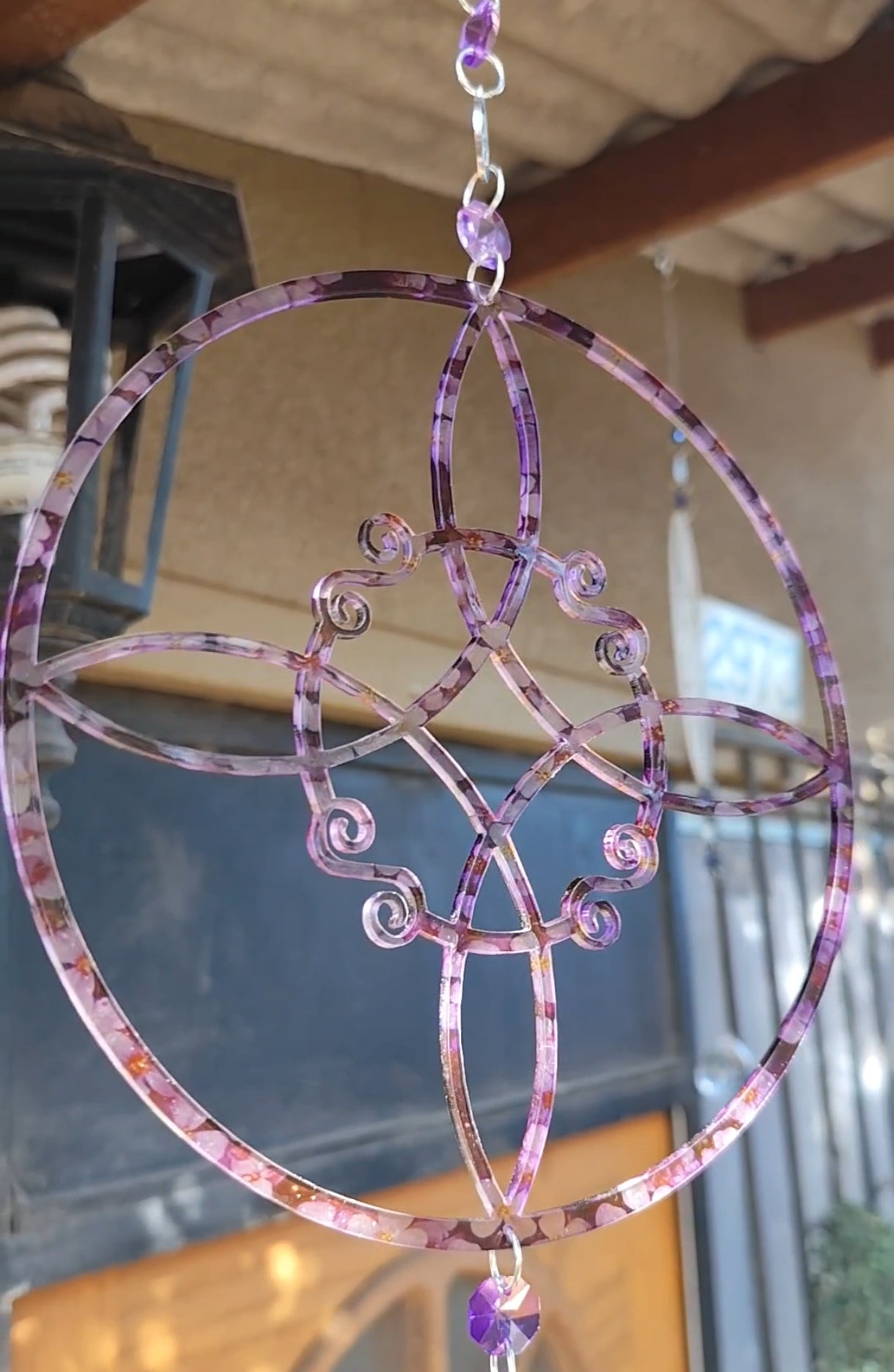 Fabricado en acrílico 3mm sublimado con flores azules cuenta con cristales que a contra luz del sol se visualizan sus colores armonizando el lugar donde se sitúe.